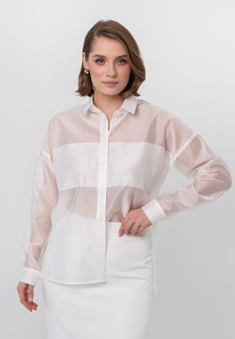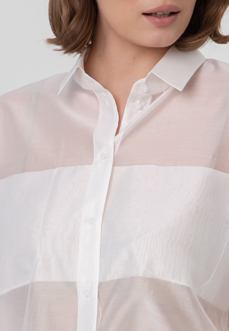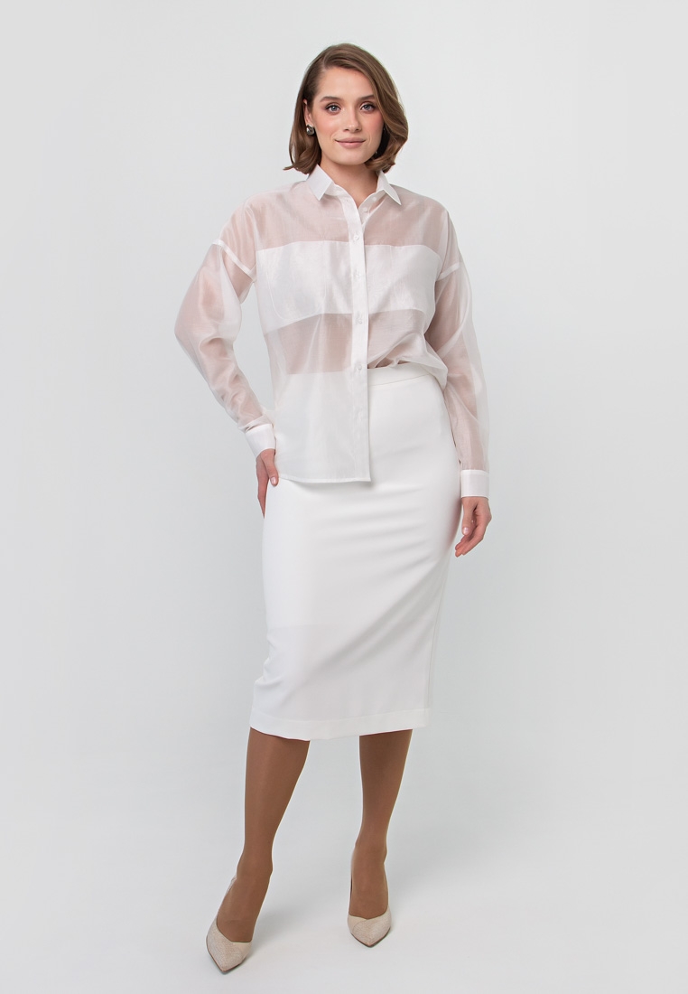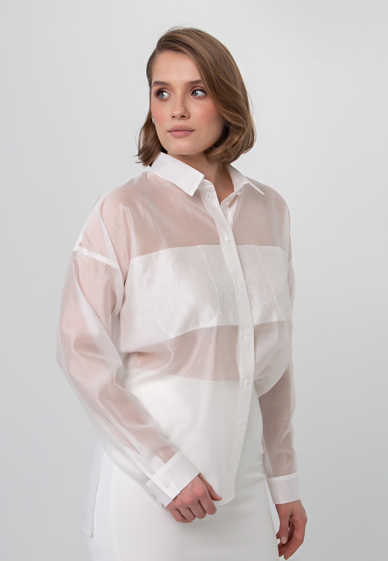 Описание: Блуза-рубашка из тонкой органзы креш. На груди на двойной складке выполнены карманы, поэтому по лифу нет прозрачности. Можно носить без внутренней маечки (на фото с белой юбкой), или с маечкой в комплекте (на фото с чёрной юбкой).