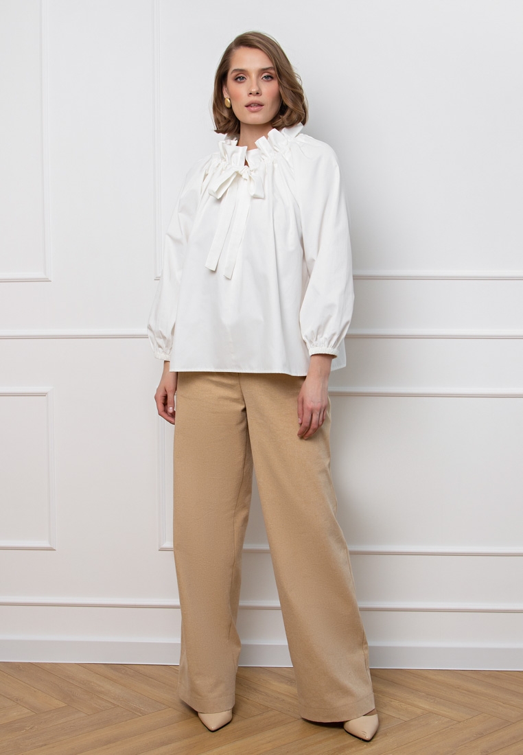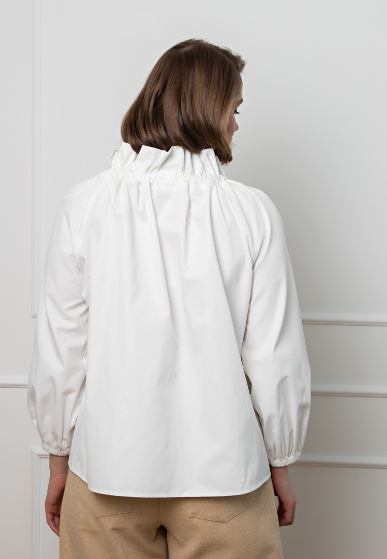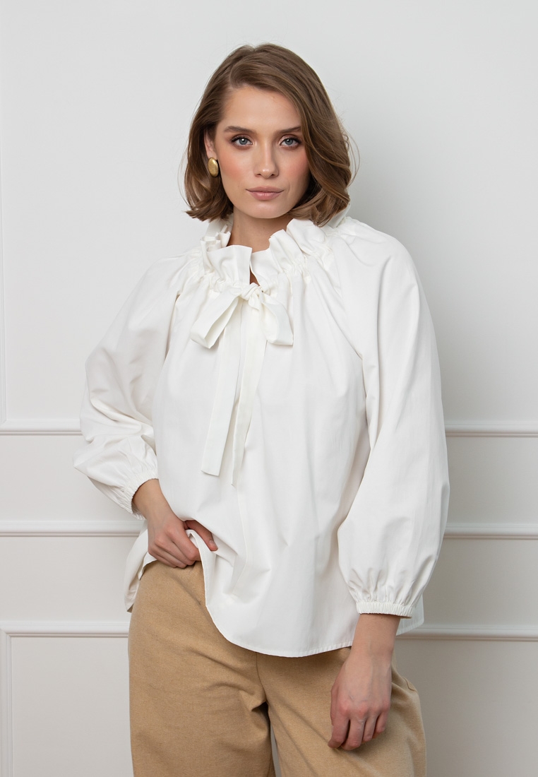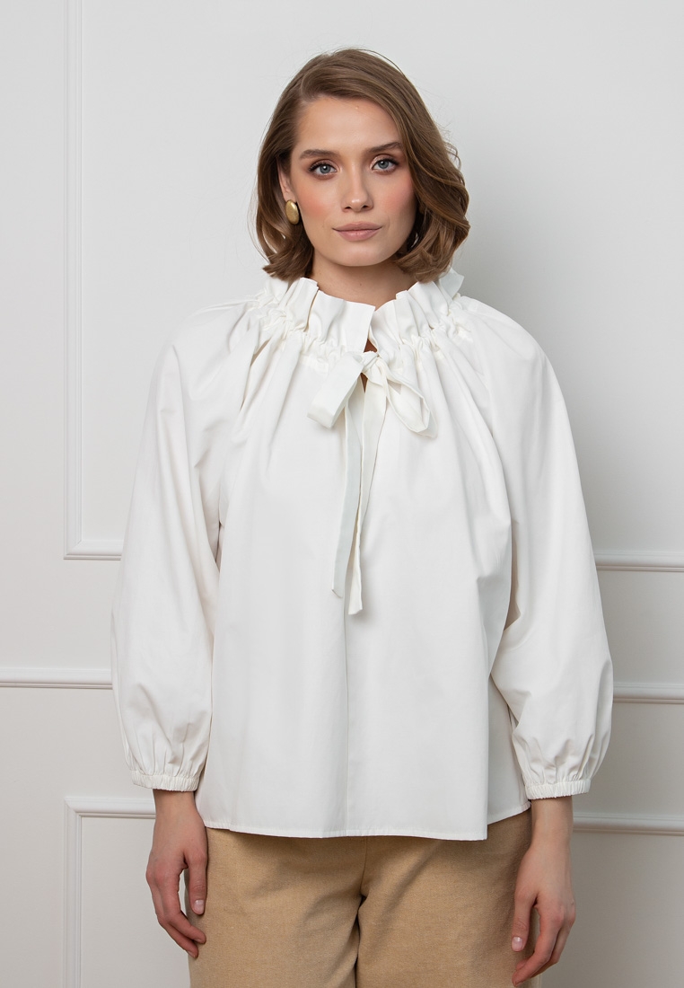 Описание: Ткань блузы не тонкая, не толстая – средней плотности, слегка бумажный хлопок. Блуза без подклада. Рукав реглан. Кулиска по горловинке регулируется (можно расслабить или затянуть), широкие завязки вставлены в горловинку. Свободный силуэт, садится плюс/минус размер.