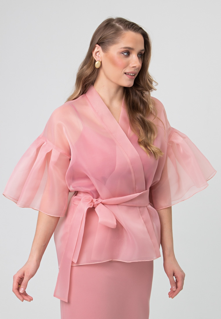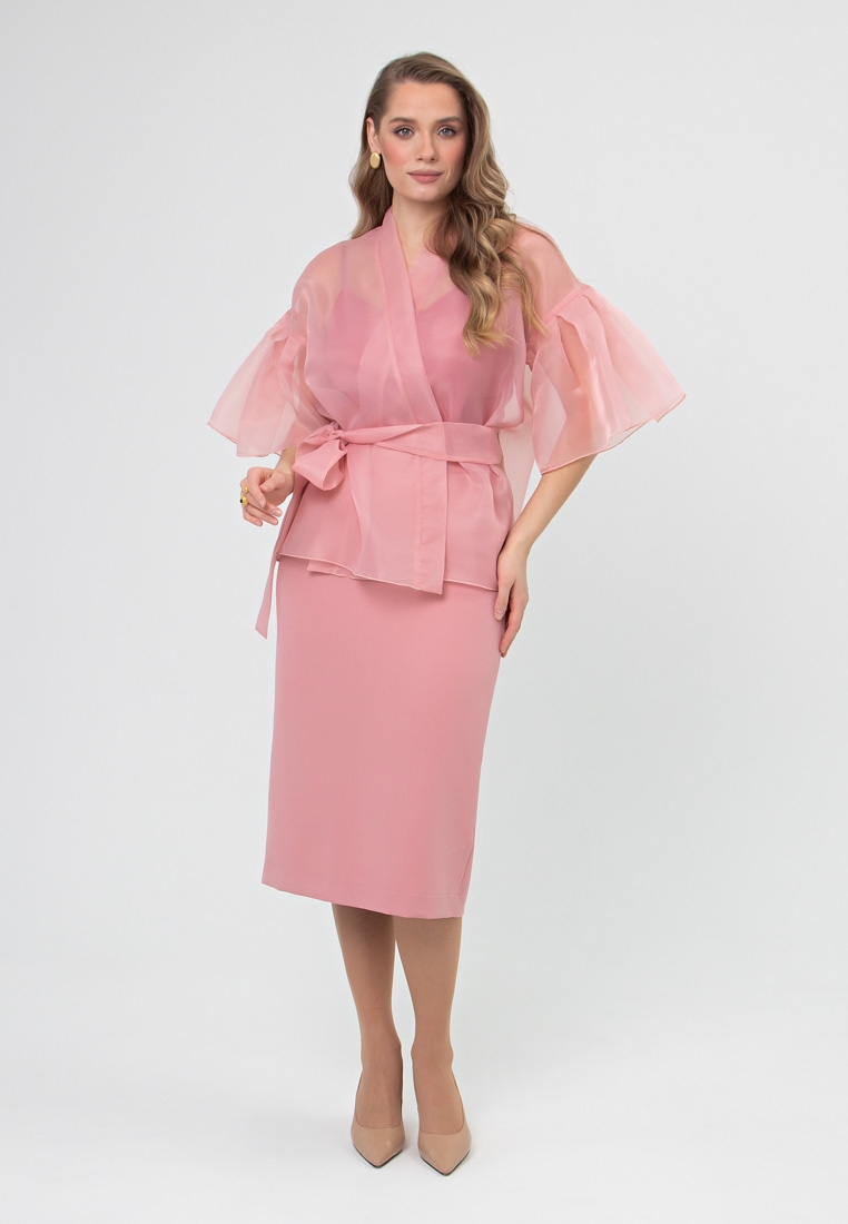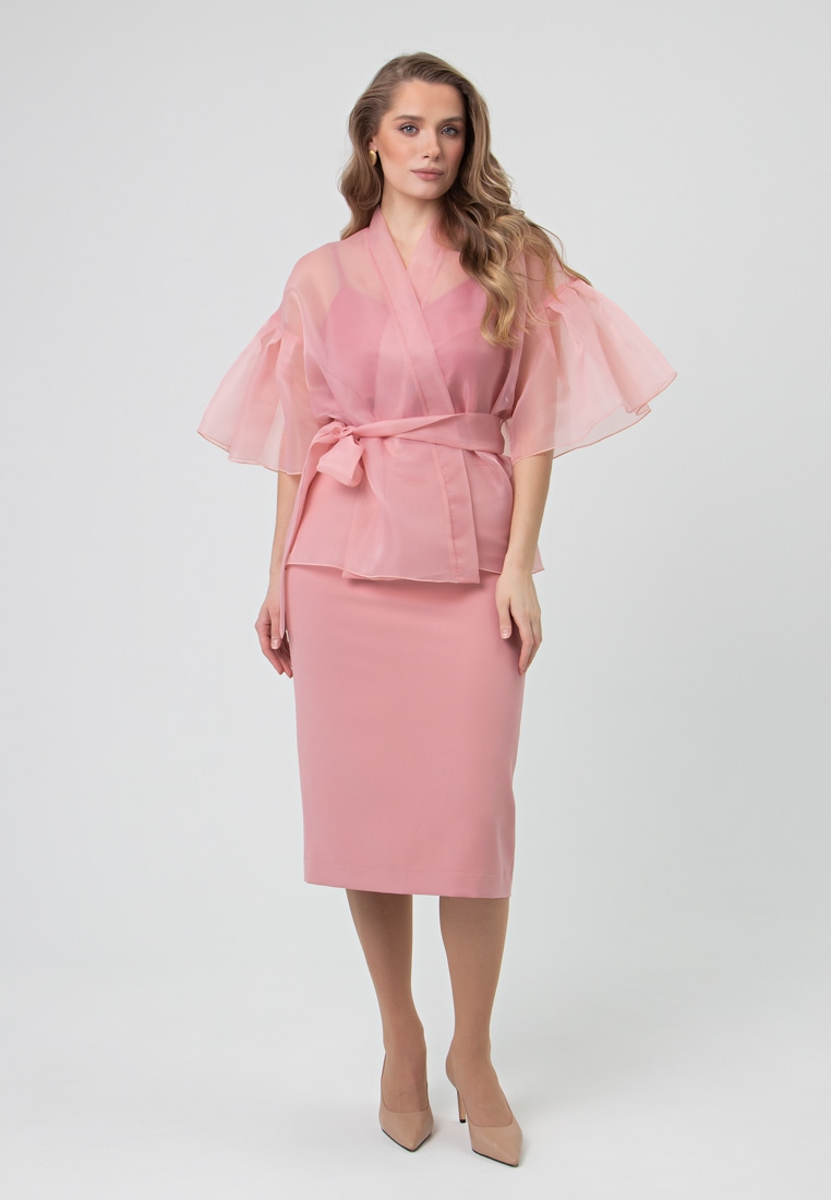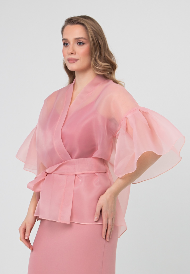 Описание: Жакет со спущенным плечом, завязывается произвольно. Без застёжек, в качестве подклада внутренняя маечка из суперсофта. Имеет фантазийный рукав. Пояс продевается в две петли с боков жакета: можно по спинке не затягивать, оставив свободной; а можно заталить жакет полностью.