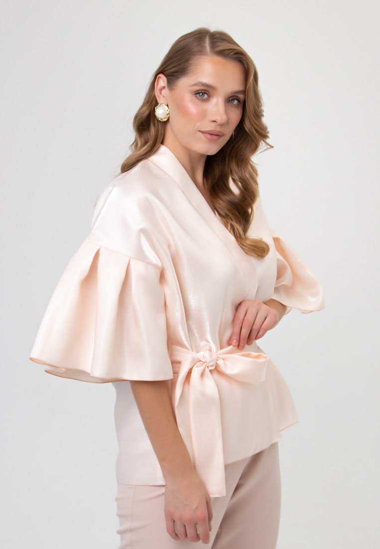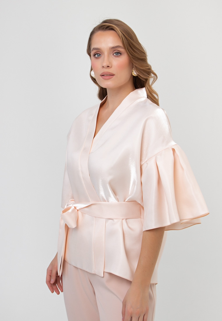 Описание: Жакет со спущенным плечом, завязывается произвольно, хлопковый, лёгкий. Без застёжек и подклада. Имеет фантазийный рукав. Пояс продевается в две петли с боков жакета: можно по спинке не затягивать, оставив свободной; а можно заталить жакет полностью.