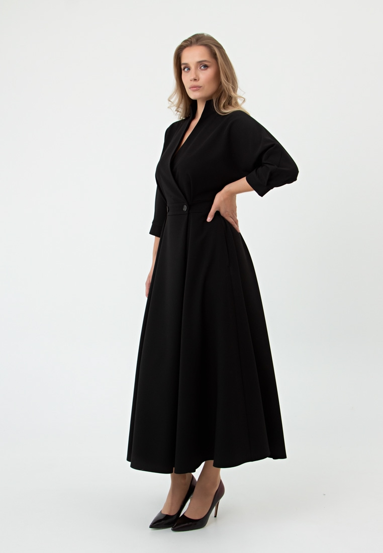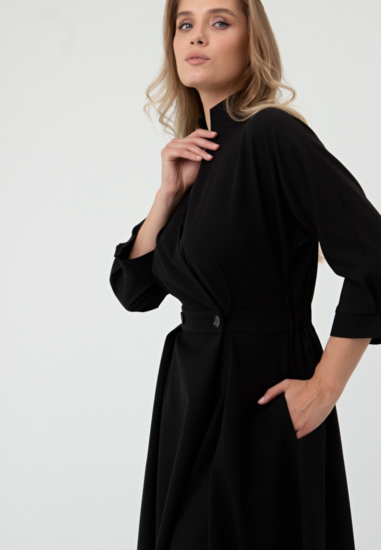 Описание: Платье полуприлегающего силуэта. Воротник стойка. Двубортная застёжка на пуговицы. Спинка на резине. Рукав ¾ собран на манжет. Карманы в боковых швах.