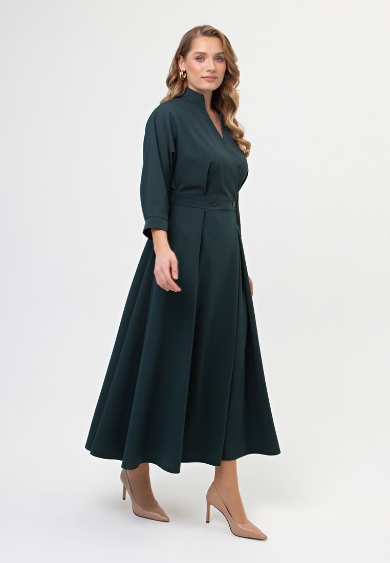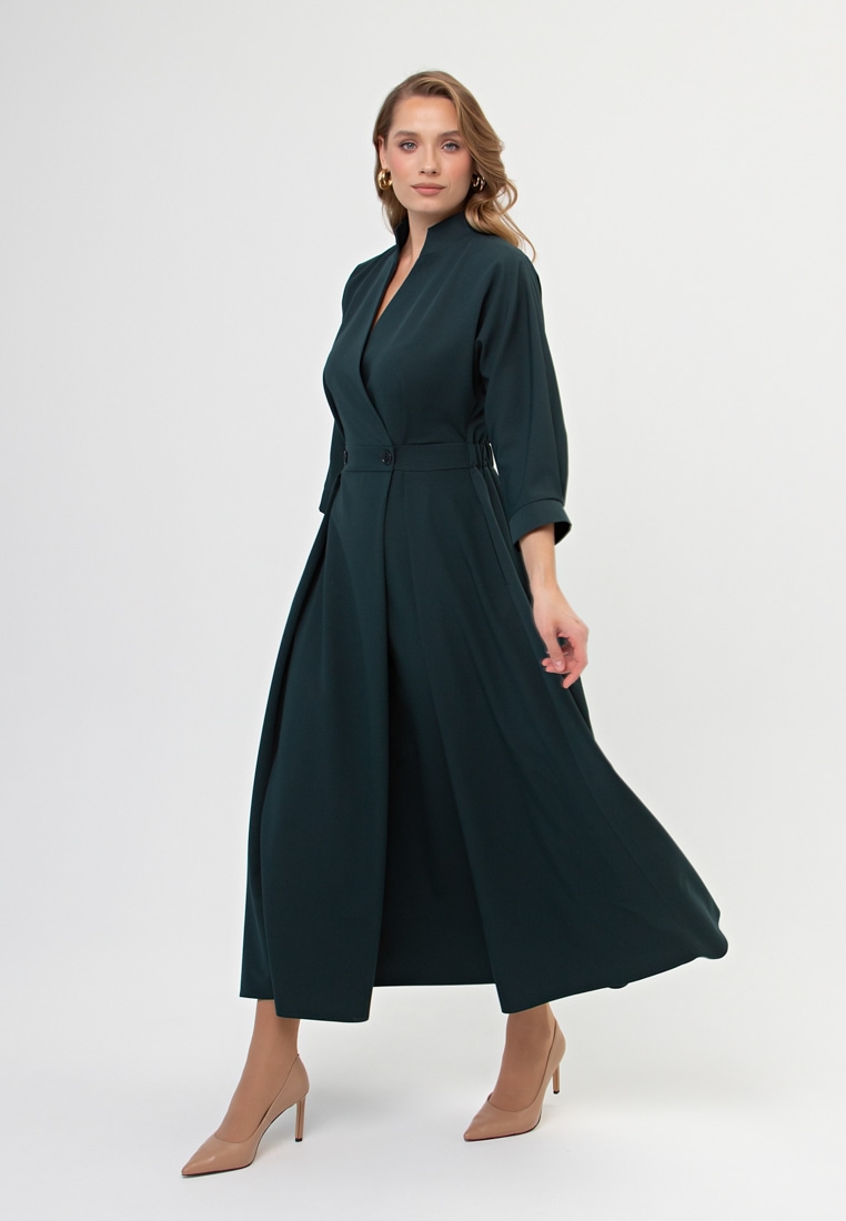 Описание: Платье полуприлегающего силуэта. Воротник стойка. Двубортная застёжка на пуговицы. Спинка на резине. Рукав ¾ собран на манжет. Карманы в боковых швах.