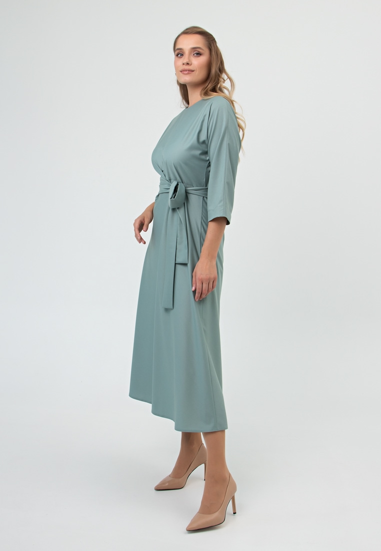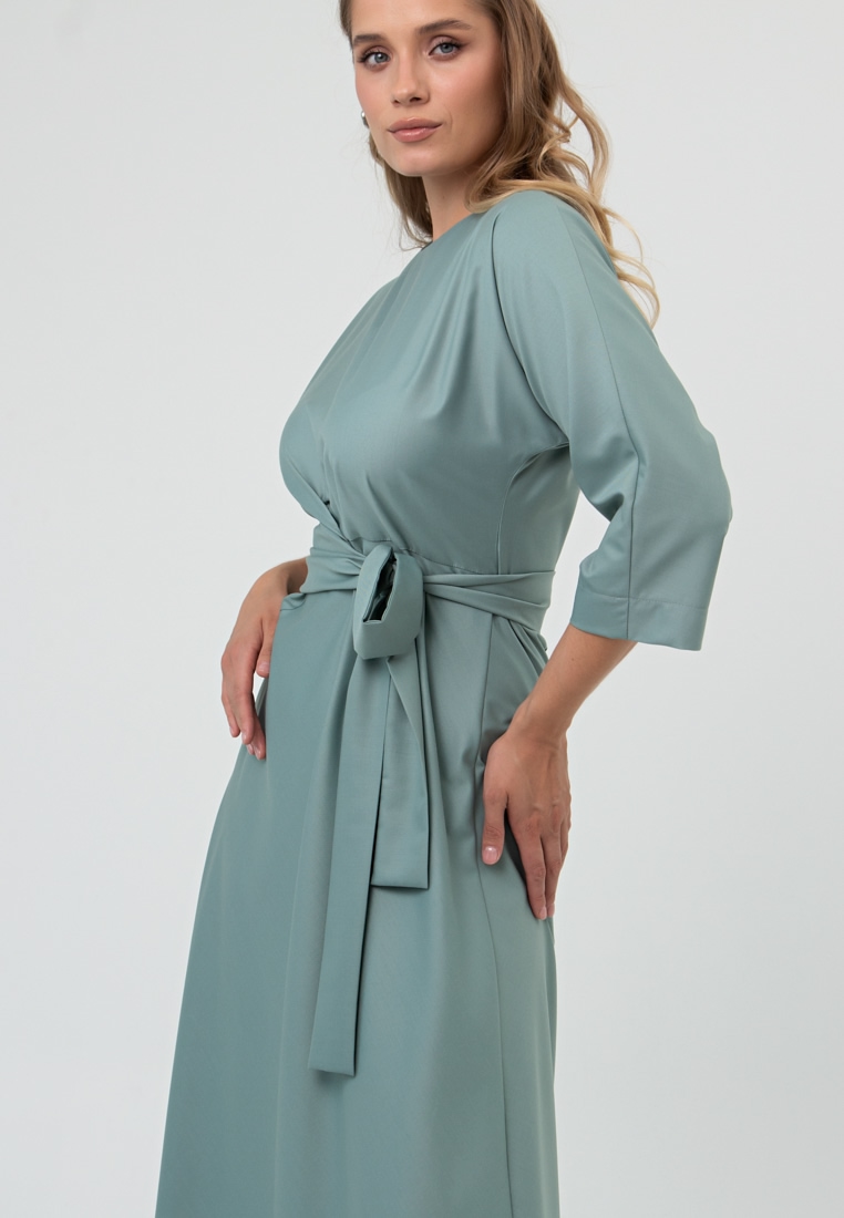 Описание: Ткань с лёгким сатиновым блеском, не мнётся, мягкая и очень комфортная по ощущениям к телу. Платье отрезное по талии, юбка скроена по косой. Цельнокроенный рукав, цельнокроенный пояс. Декоративный элемент на поясе смоделирован цельно, т.е. пояс достаточно только опоясать и завязать. Данный вариант платья без подклада. По спинке молния. Платье хорошо маскирует талию и животик.