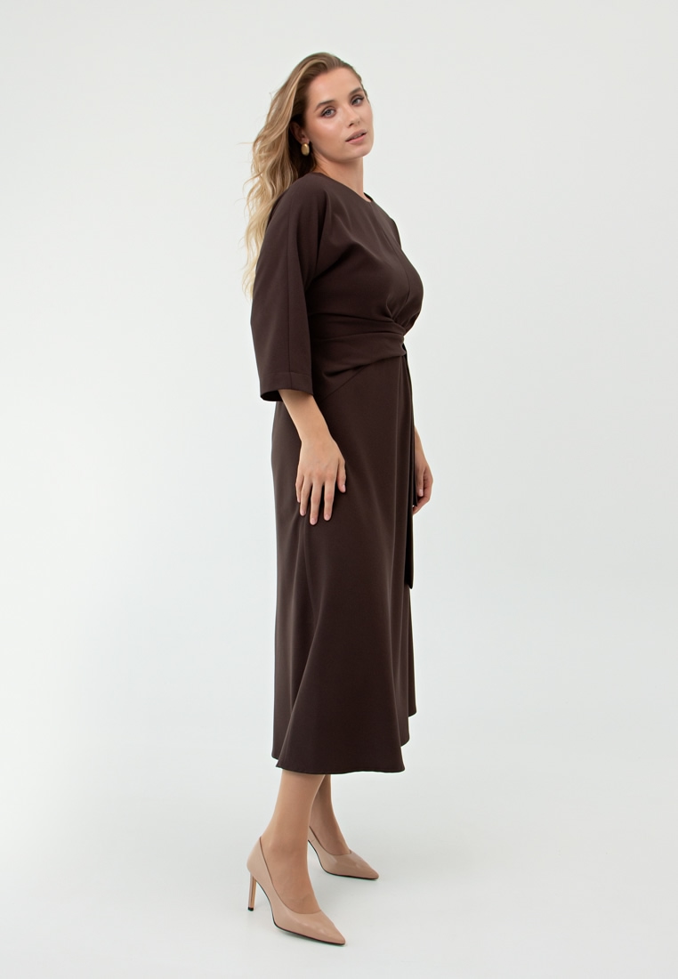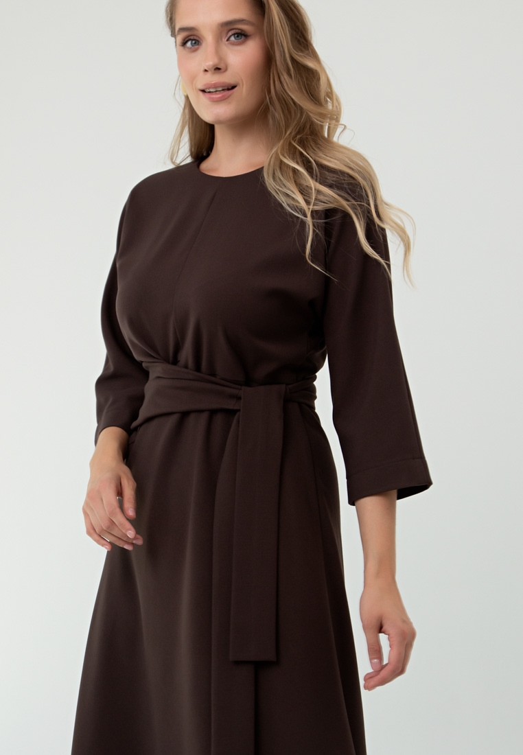 Описание: Платье отрезное по талии, юбка скроена по косой. Цельнокроенный рукав, цельнокроенный пояс. Декоративный элемент на поясе смоделирован цельно, т.е. пояс достаточно только опоясать и завязать. Данный вариант платья на подкладе. По спинке молния. Платье хорошо маскирует талию и животик.