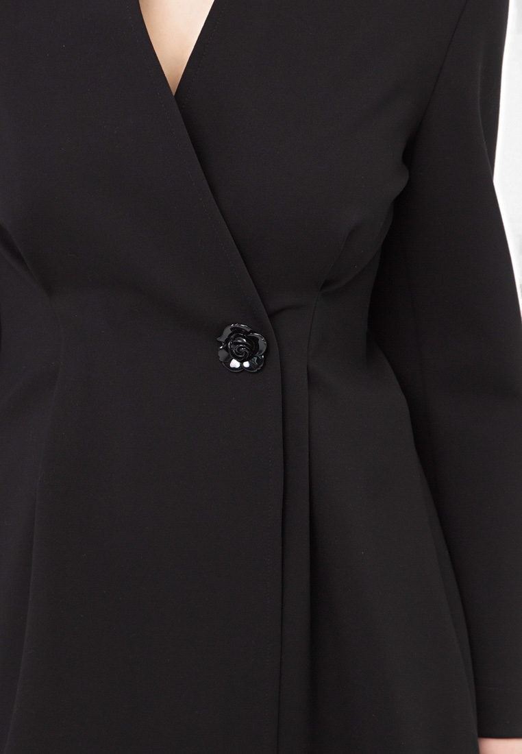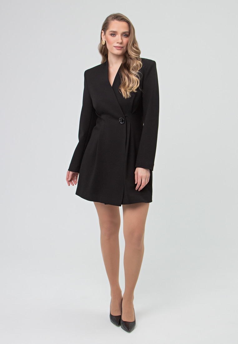 Описание: Платье-пиджак с подплечниками, формирует красивую линию плеч. Исполнено из толстенького джерси, без подклада. Двубортная застёжка на две внутренние кнопки, снаружи декоративная пуговица роза. Платье очень стройнит.