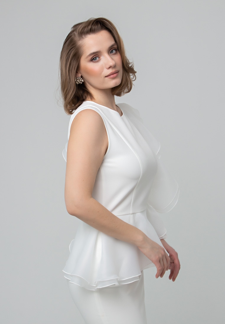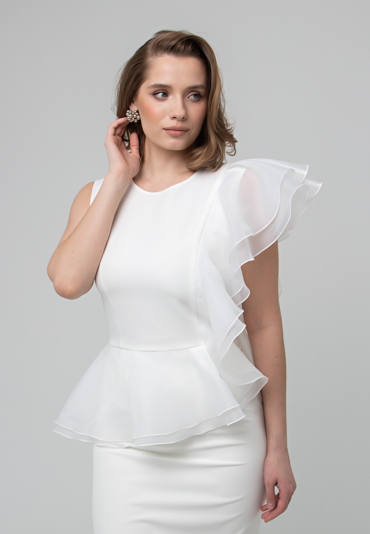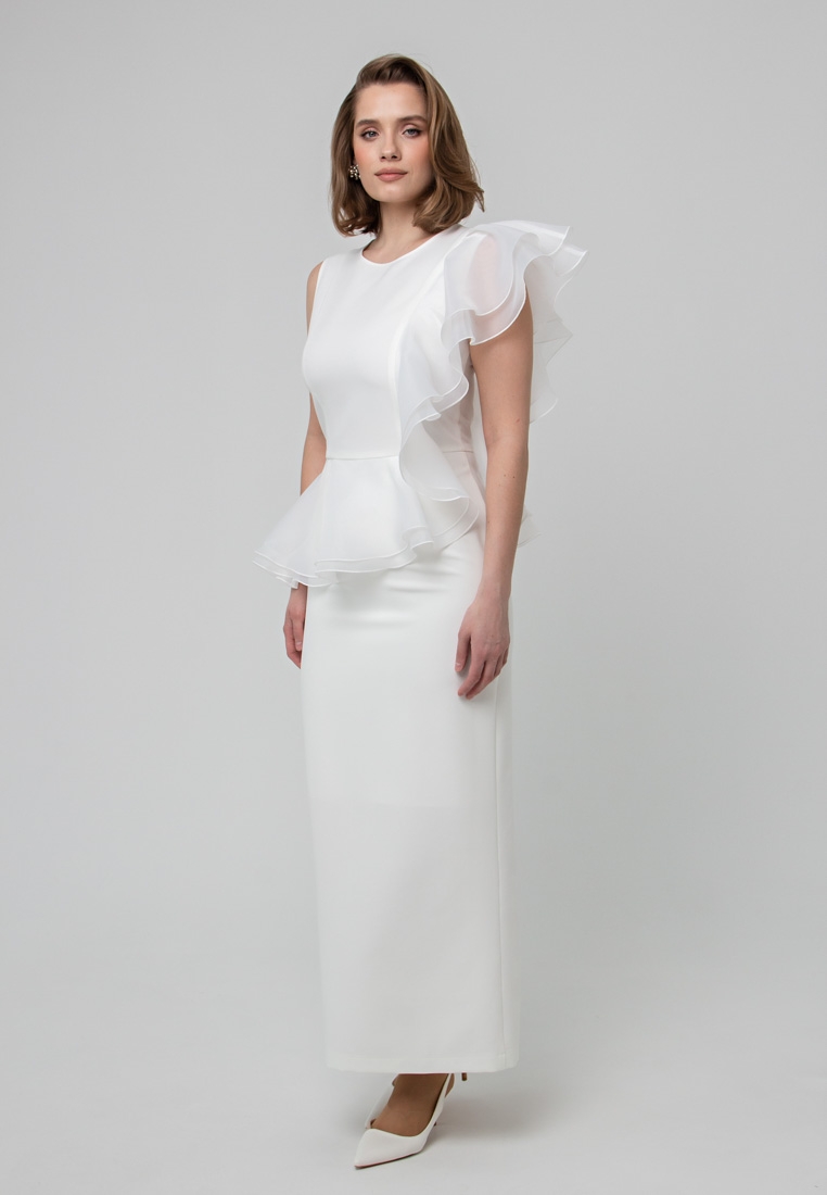 Описание: Платье по фигуре, облегающего силуэта. Юбка на стрейчевом подкладе из суперсофта, высокий разрез. Застёжка-молния на спинке. Волан исполнен из органзы в два слоя.