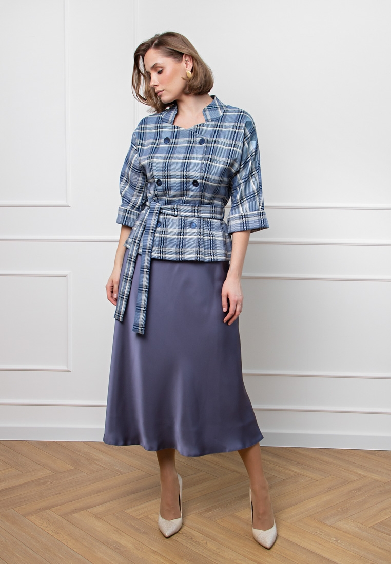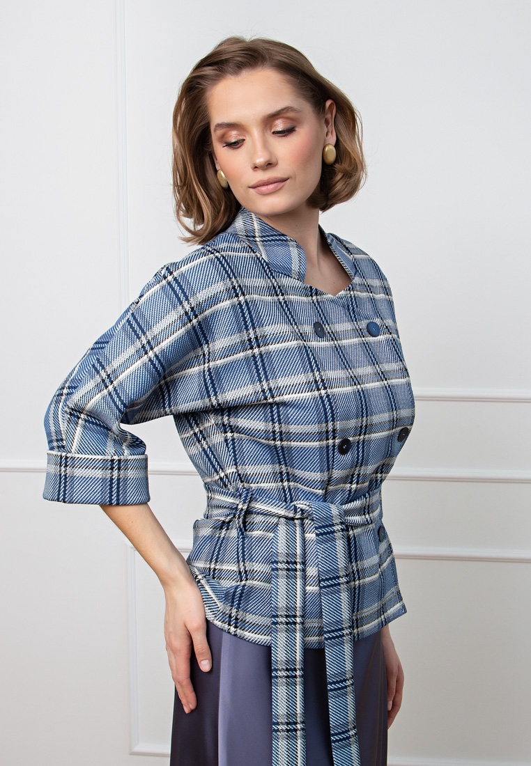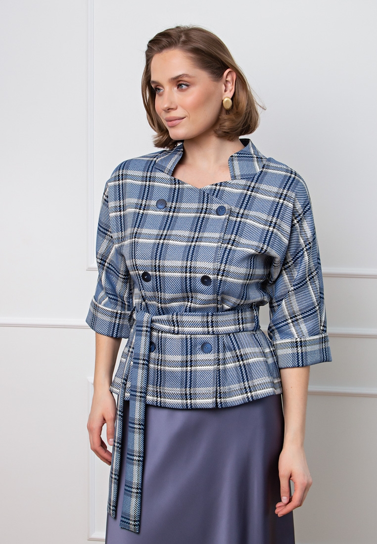 Описание:  Двубортный жакет, без подкладки, застёжка на пуговицы, по спинке встречная складка. Длина по спинке 66 см.