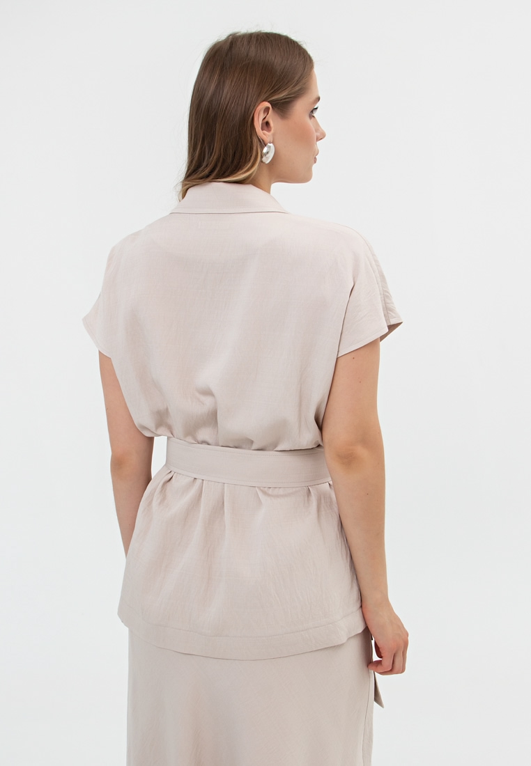 Описание:  Двубортная застёжка на две пуговицы, пояс в комплекте, ручка прикрыта спущенным плечом.