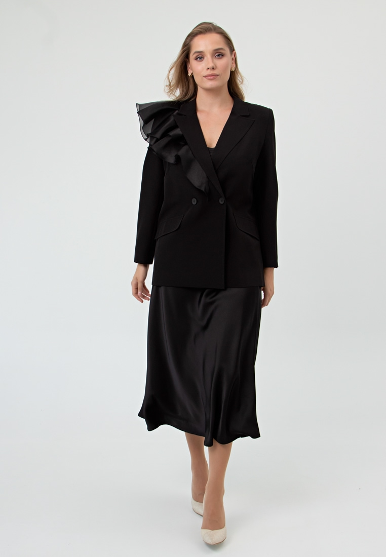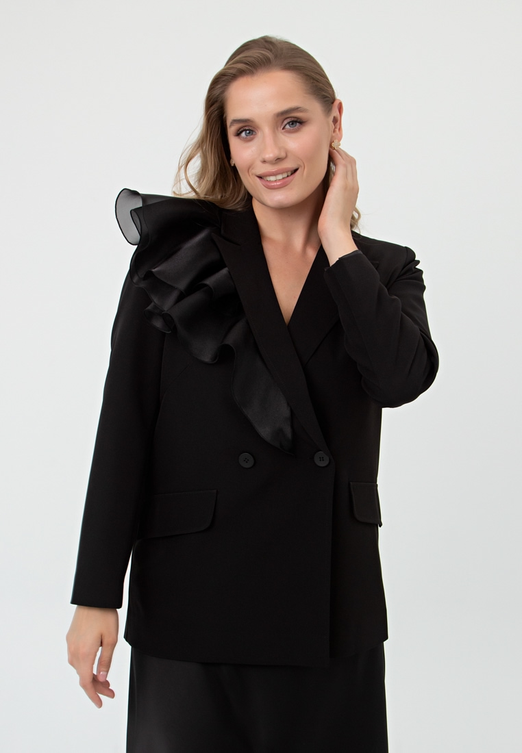 Описание: Классический жакет свободного кроя, на подкладе. Застёжка на пуговицы, присутствуют подплечники. В комплекте пристёгивающийся на потайные пуговки двойной волан из органзы. Волан можно пристёгивать на двух уровнях: начиная с воротника (как на фото), или начиная с лацкана (чуть ниже). По спинке жакета присутствует утяжка.