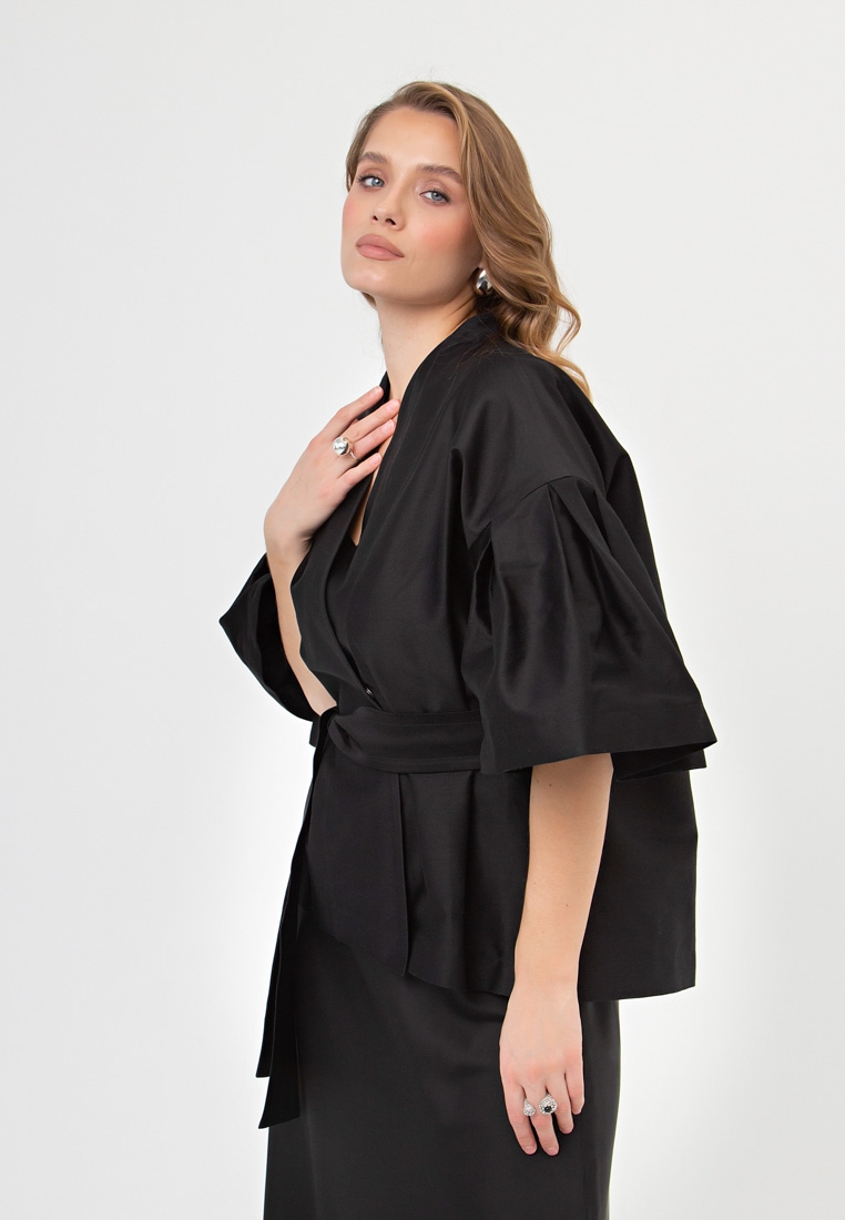 Описание: Жакет завязывается произвольно, хлопковый, лёгкий. Пояс продевается в две петли с боков жакета: можно по спинке не затягивать, оставив свободной; а можно заталить жакет полностью. Без застёжек и подклада. Рукав с воланом.